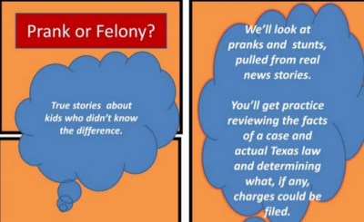 That's why I created the "Prank or Felony" slideshow and teaching unit. The slideshow discusses actual pranks, pulled from news stories, that were eventually charged as crimes. The slideshow serves as both an introduction to reading and thinking about the law and as a series of morality tales that might possibly help young people to stop and think before acting.